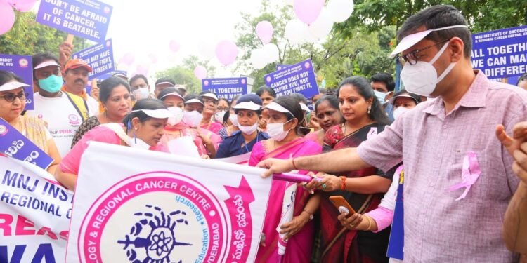 బ్రెస్ట్ క్యాన్సర్ మహమ్మారిని నిర్మూలించే బాధ్యత సమాజంలో మనందరిపై ఉందన్నారు ఎమ్మెల్సీ కల్వకుంట్ల కవిత. హైదరాబాద్ లోని ఎమ్ ఎన్ జె క్యాన్సర్ హాస్పటల్ లో బ్రెస్ట్ క్యాన్సర్ పై అవగాహనా కార్యక్రమంలో ఎమ్మెల్సీ కల్వకుంట్ల కవిత పాల్గొన్నారు. ఈ సందర్భంగా ‘బ్రెస్ట్ క్యాన్సర్ అవేర్ నెస్ వాక్’ ను ఎమ్మెల్సీ కవిత జెండా ఊపి ప్రారంభించారు. ఈ సందర్భంగా ఎమ్మెల్సీ కవిత మాట్లాడుతూ, గతంలో 60 ఏండ్ల పైబడిన వాళ్లకు వచ్చే క్యాన్సర్ ఇప్పుడు 30 సంవత్సరాలకే వస్తున్నదని, కాబట్టి జాగ్రత్తలు తీసుకోవాల్సిన అవసరం కుటుంబ సభ్యుల మీద కూడా ఉందన్నారు.