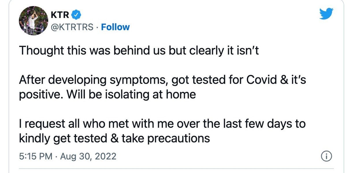 ktr Carona news తెలంగాణ ఐటీ శాఖ మంత్రి, తెరాస కార్యనిర్వాహక అధ్యక్షుడు కేటీఆర్ మరోసారి కరోనా బారిన పడ్డారు. తనకు కరోనా పాజిటివ్గా నిర్ధారణ అయినట్టు ఆయన ట్విటర్లో వెల్లడించారు. కొన్ని లక్షణాలు కనబడటంతో పరీక్షలు చేయించుకున్నానని.. కొవిడ్ పాజిటివ్గా తేలినట్టు ఆయన పేర్కొన్నారు. ప్రస్తుతం హోం ఐసోలేషన్లోనే ఉన్నట్టు తెలిపారు. గత కొన్ని రోజులుగా తనను కలిసిన వారు పరీక్షలు చేయించుకోవాలని, ముందుస్తు జాగ్రత్తలు పాటించాలని సూచించారు.