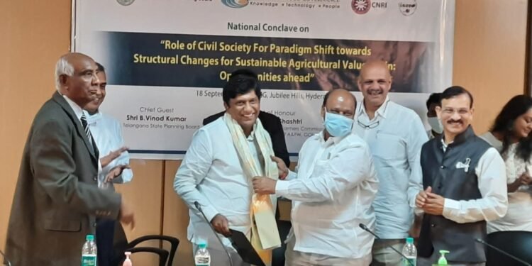 ఈ సెమినార్ లో రాష్ట్ర ప్రణాళికా సంఘం వైస్ చైర్మన్ బోయినపల్లి వినోద్ కుమార్ మాట్లాడుతూ రాష్ట్ర ప్రభుత్వం రైతుల సంక్షేమం కోసం అహర్నిశలు కృషి చేస్తోందని అన్నారు. రాష్ట్ర ప్రభుత్వం నీటి పారుదల, వ్యవసాయ, విద్యుత్ రంగాల్లో చేపట్టిన విప్లవాత్మక చర్యల వల్ల ఆయా రంగాల్లో గణనీయమైన అభివృద్ధిని సాధించిందని పేర్కొన్నారు. ఇదే విషయాన్ని నీతి ఆయోగ్ అర్త్ నీతి నివేదికలో స్పష్టంగా పేర్కొందని వినోద్ కుమార్ తెలిపారు. వ్యవసాయ, దాని అనుబంధ సంస్థలలో తెలంగాణ ఆవిర్భావం ముందు రెండు శాతం ఉన్న గ్రోత్ ప్రస్తుతం 16.5% శాతానికి చేరుకుందని అన్నారు. వ్యవసాయం, ఫిషరీస్, లైవ్ స్టాక్, ఫారెస్ట్రీలో రూ. 76, 123 కోట్ల నుంచి ప్రస్తుతం రూ. 1, 84, 321 కోట్లకు తెలంగాణ రాష్ట్రం చేరిందని వినోద్ కుమార్ తెలిపారు. వరి స్థూల విలువ రూ. 9, 528 కోట్ల నుంచి రూ. 47, 440 కోట్లకు చేరిందని, కందుల విలువ రూ. 530 కోట్ల నుంచి రూ. 3,808 కోట్లకు చేరిందని, తలసరి ఆదాయం రూ. 1,24,104 నుంచి రూ. 2,37,632 కు చేరిందని అన్నారు.